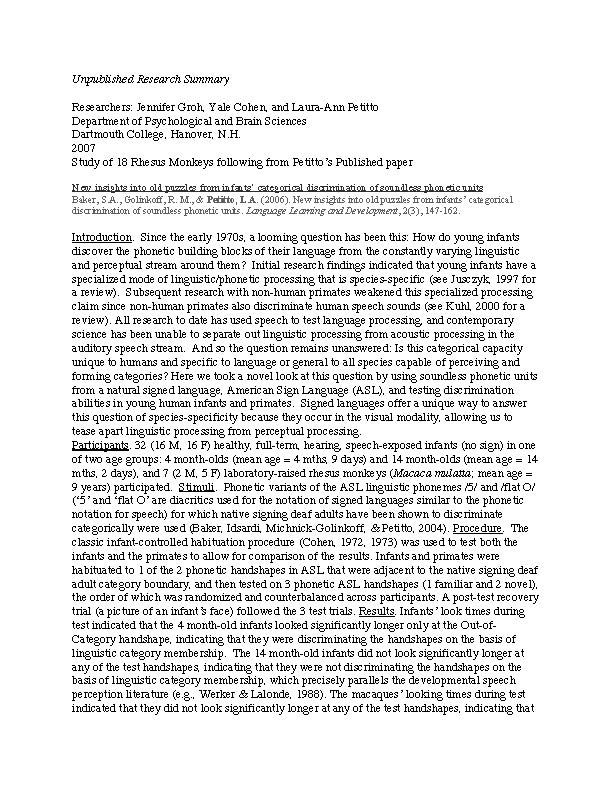 Unpublished study abstract: Study of categorical discrimination in 18 Rhesus Monkeys following from infants’ categorical discrimination of soundless phonetic units in Baker, Golinkoff, and Petitto (2006). Groh, J., Cohen, Y., and Petitto, L.A. (2007).