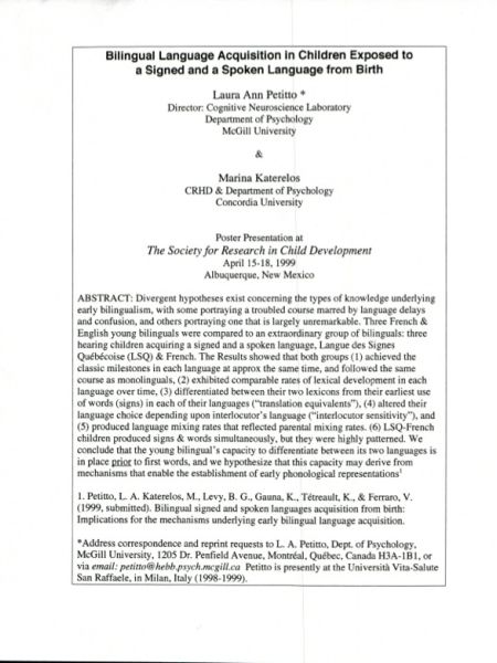 Does Early Exposure to a Visual Signed Language ‘hurt’ Auditory Language Tissue Development: Evidence from fNIRS Neuroimaging of Language Processing in Deaf Individuals with Cochlear Implants Jasinska, K., Langdon, C., and Petitto, L. A. (2013, November)